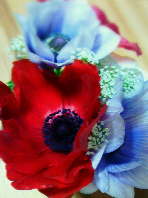 真紅とラベンダー色のアネモネに