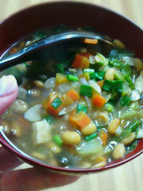 大根、人参、白菜、椎茸、油揚げ、ネギ、納豆・・・